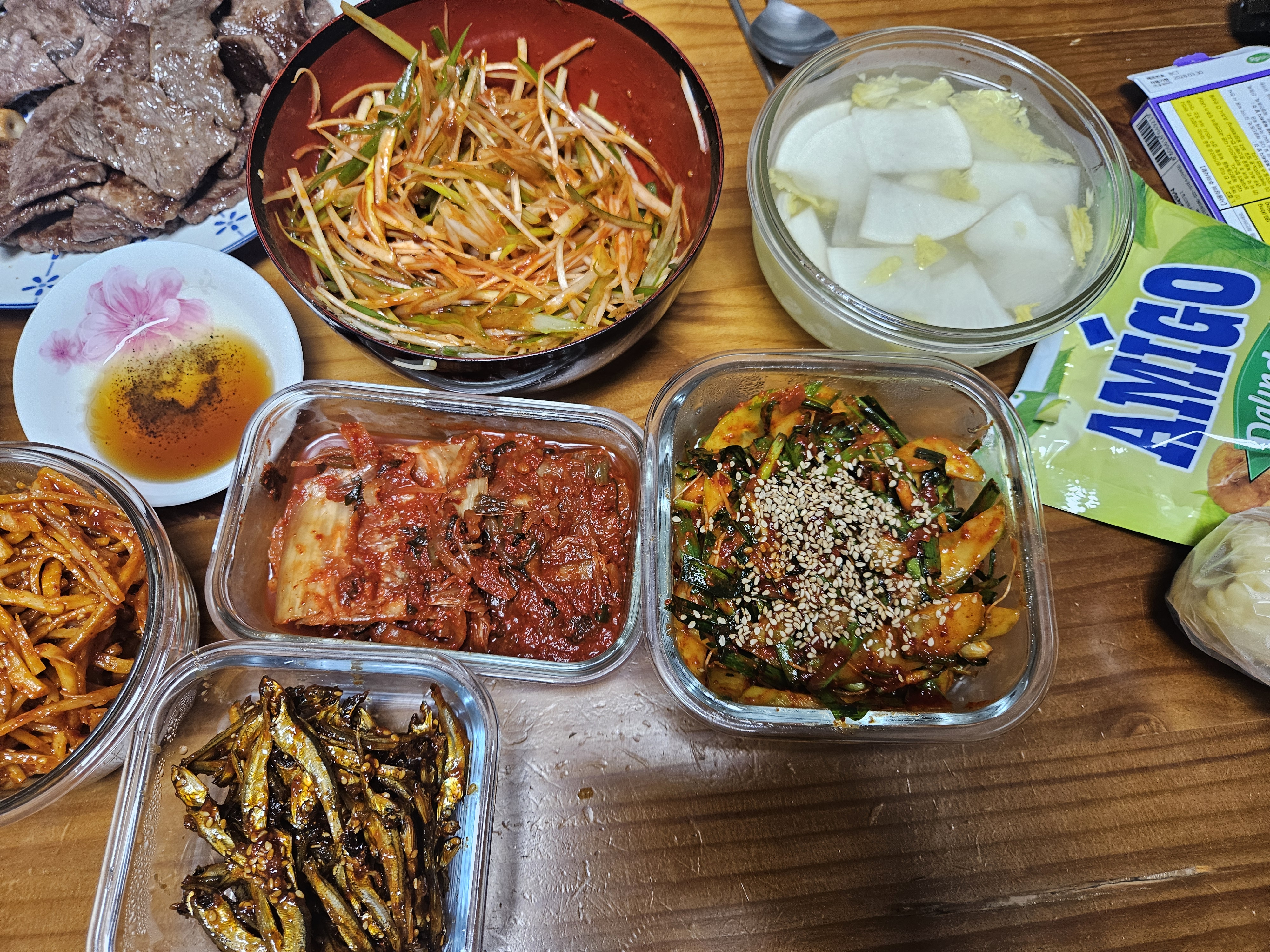 진미채볶음. 멸치볶음. 오이무침. 달래간장~